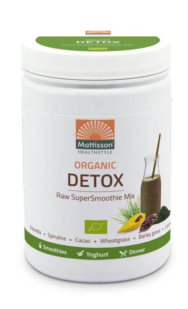 SuperSmoothie Mix Detox Bio is samengesteld uit biologische Chlorella, Spirulina, Wheatgrass, Barley grass en Lucuma.