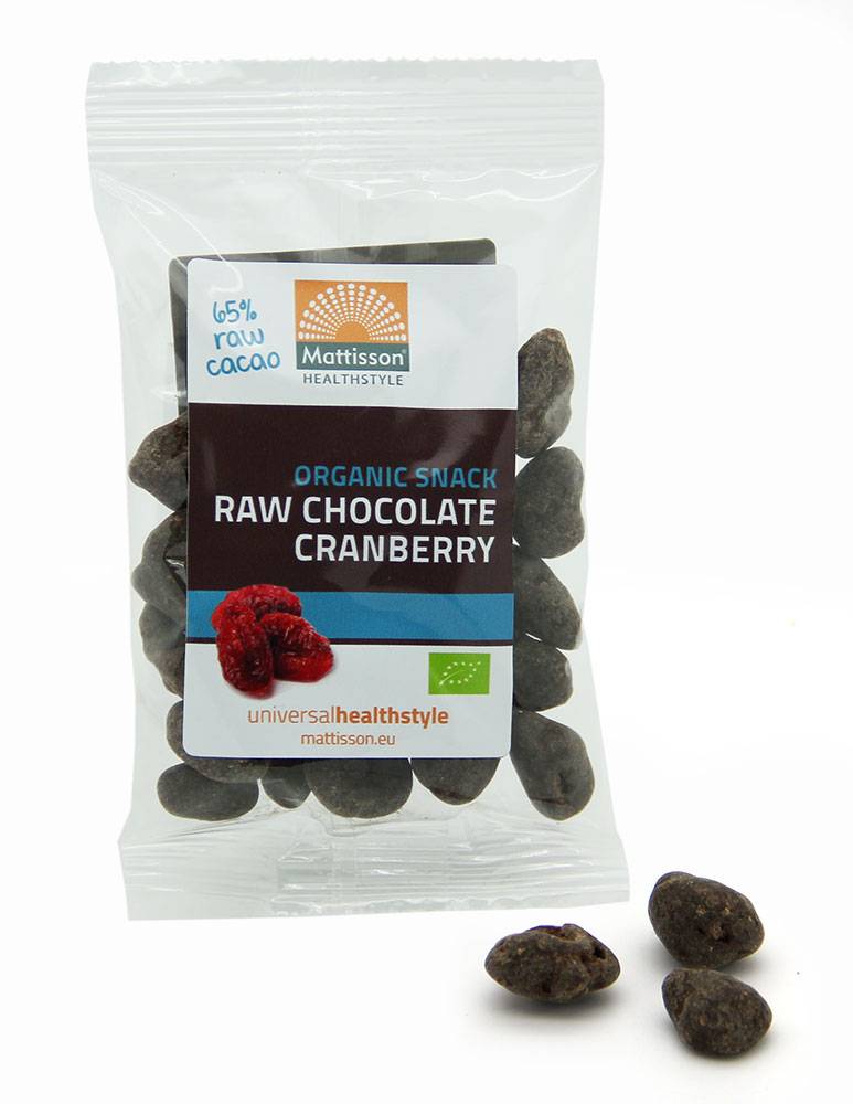 Biologische cranberries ondergedompeld in rauwe chocolade. In handige portie/meeneem verpakkingen van 35g.Gebruik en bewaren