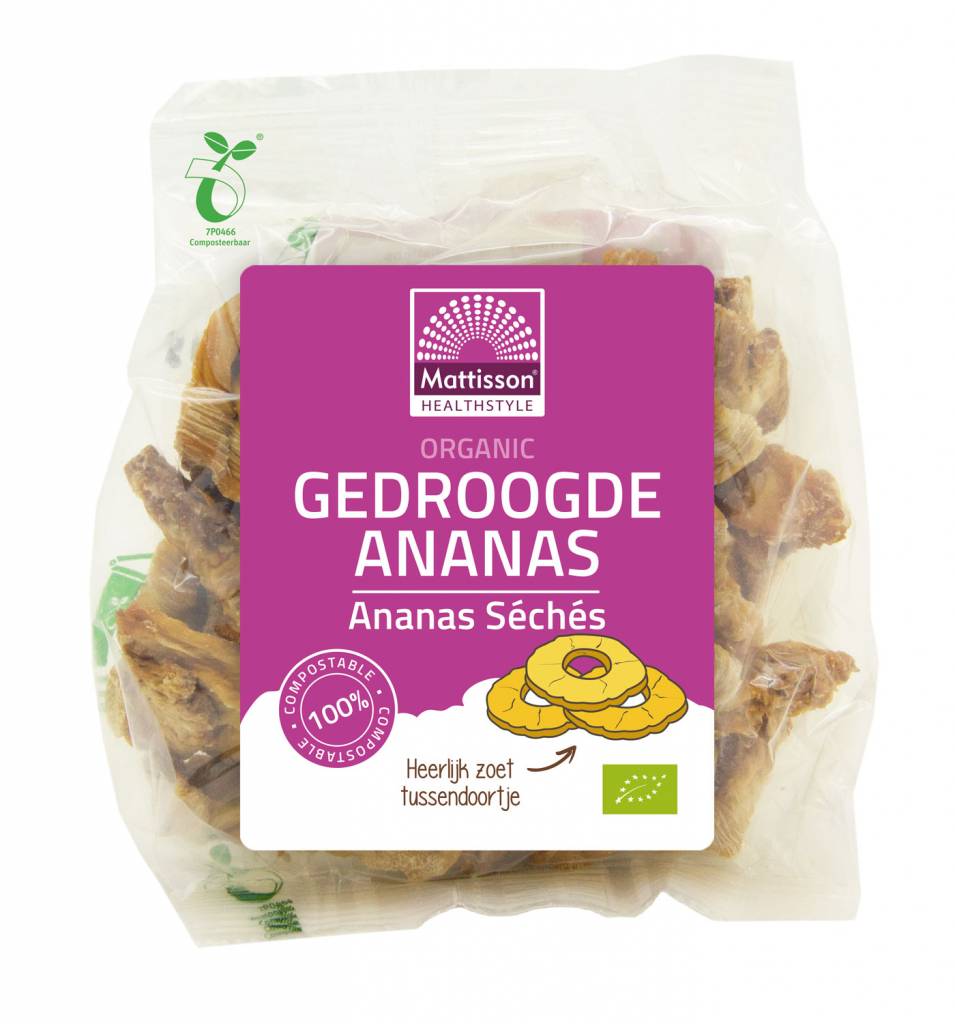 De biologische ananas wordt in Sri Lanka geoogst als deze volledig gerijpt is. Na het oogsten wordt de huid en het middelste deel van de ananas verwijderd en het vlees in ringen gesneden en gedroogd. Gedroogde ananas is heerlijk als tussendoortje in smoothies en yoghurt.100% composteerbare folie.
